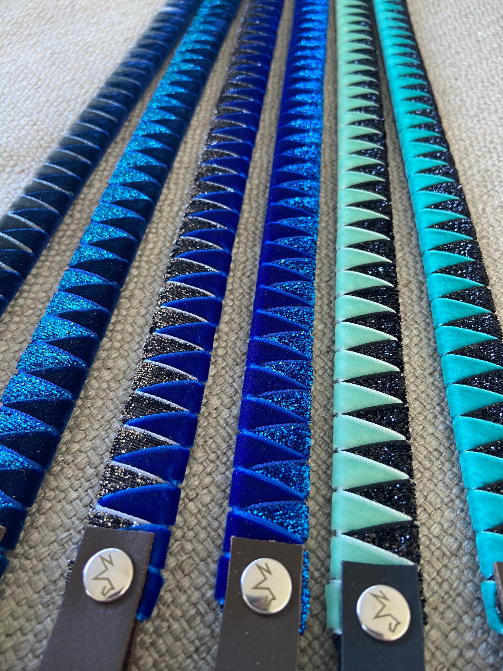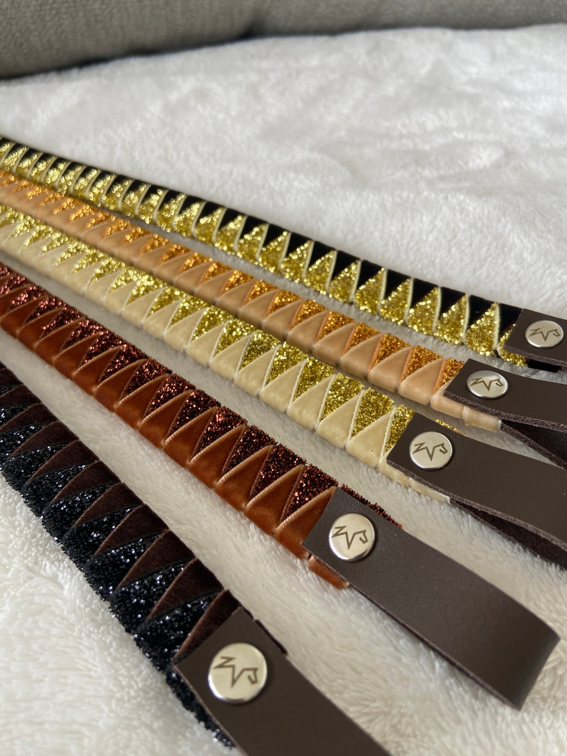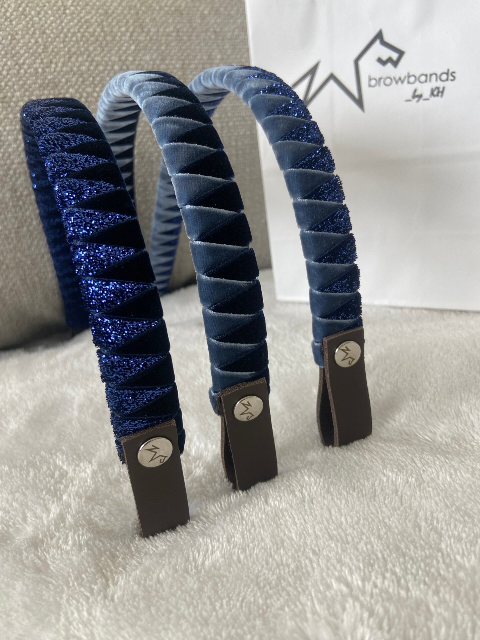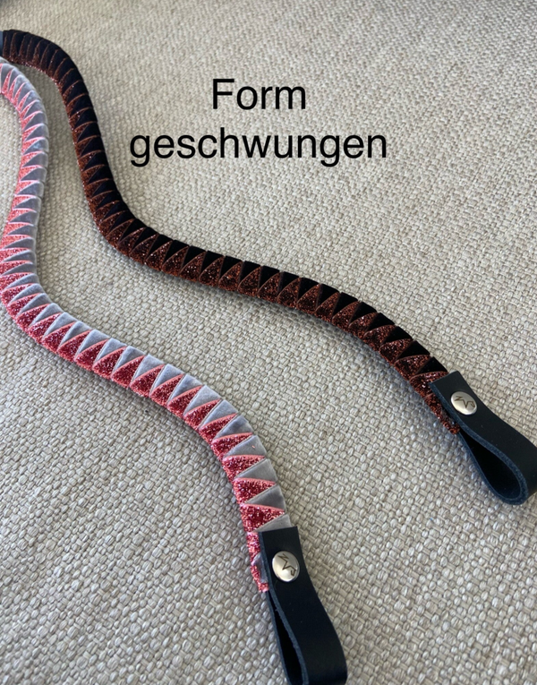 Handgefertigter Stirnriemen ganz nach deinen Wünschen in deinen Lieblingsfarben. Zur Auswahl stehen zahlreiche Farben in Samt- oder Glitzersamtoptik. Die Grundlage des Stirnriemens ist aus Leder gefertigt. Die Breite beträgt etwa 1,7 cm, Schlaufengröße ca. 3 cm. Größen: Pony - 38 cm VB - 41 cm WB - 43 cm WB xl - 45 cm